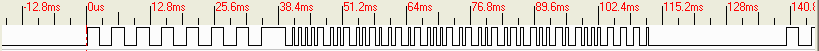 hold the button we detect 45 high and 44 low values. This takes about 112.48 ms fron head to tail. As long as you keep the button pressed this same bit-train is repeated, with an interval/pause of 28 ms between the bit-trains. The first 14 bits (run-in) take 34.88 ms (2.49 ms per bit) |